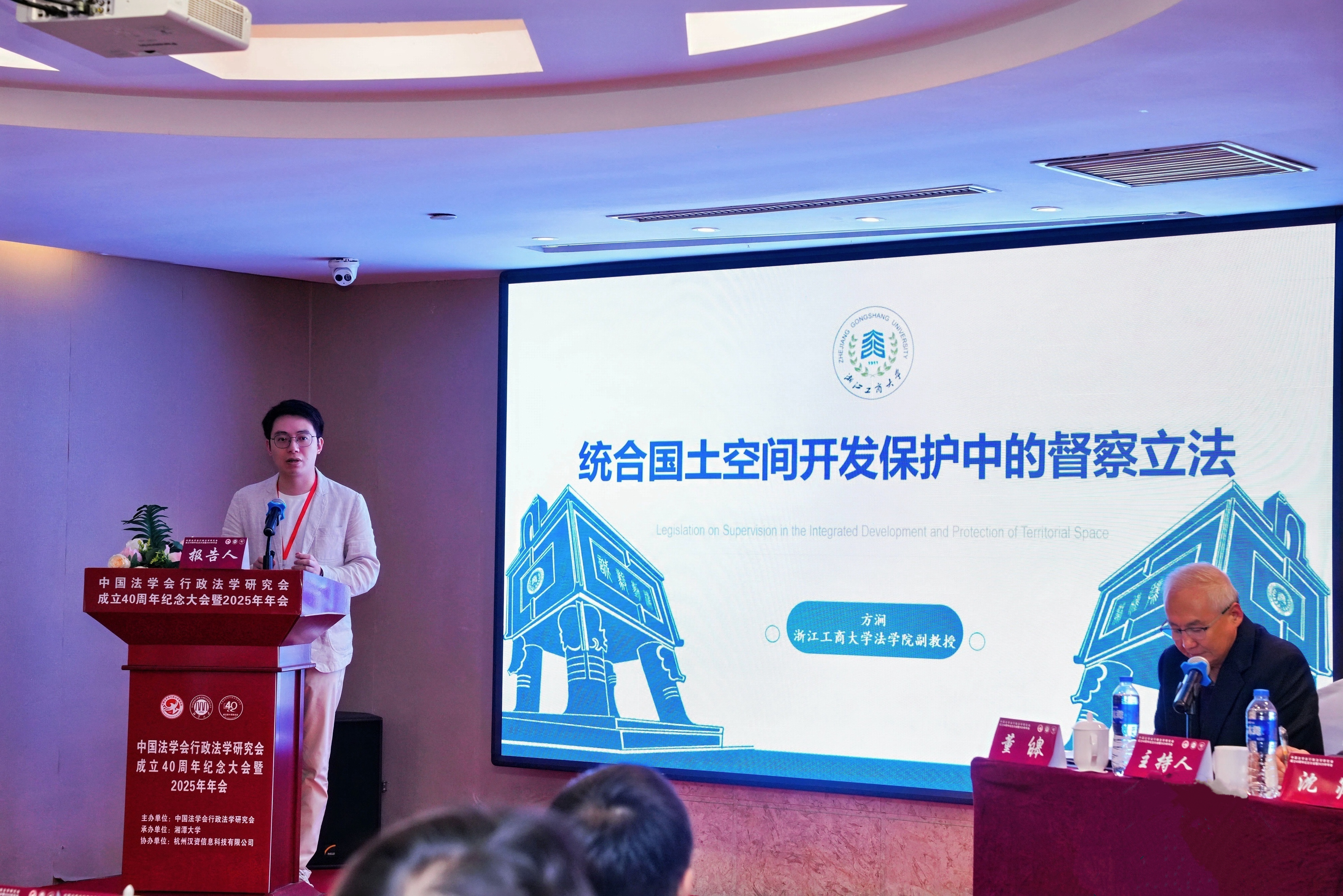 2025年10月18日至10月19日,中国法学会行政法学研究会2025年年会在湖南湘潭隆重召开。本次年会由中国法学会行政法学研究会主办,湘潭大学承办,旨在进一步探讨如何全面深化改革与法治政府建设,推动我国行政法治建设,共绘新时代行政法治发展蓝图。500余位来自全国各地的行政法学界专家学者齐聚一堂,围绕“中国行政法学自主知识体系的构建与转型”“行政执法体制机制改革”“国家赔偿法与行政诉讼法的完善”等前沿议题展开深入研讨。浙江工商大学法学院方涧副教授受邀出席本次年会,并在“具体领域中的行政法(学)发展与改革”分论坛作题为《统合国土空间开发保护中的督察立法》的专题报告。